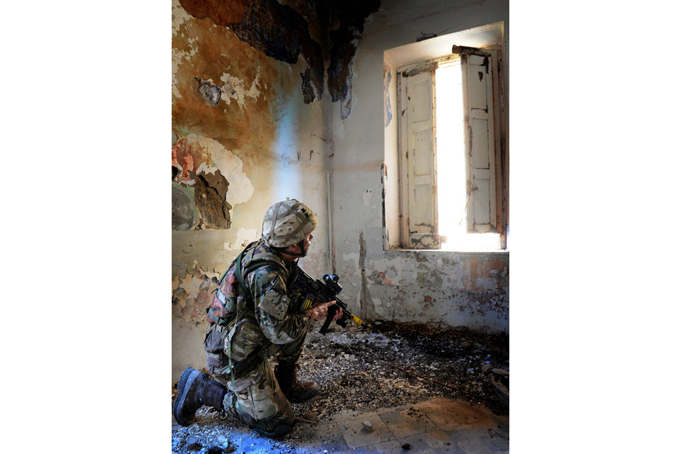 A Royal Marine looks out for the enemy during the assault on Sazan Island [Picture: Petty Officer (Photographer) Sean Clee, Crown copyright]