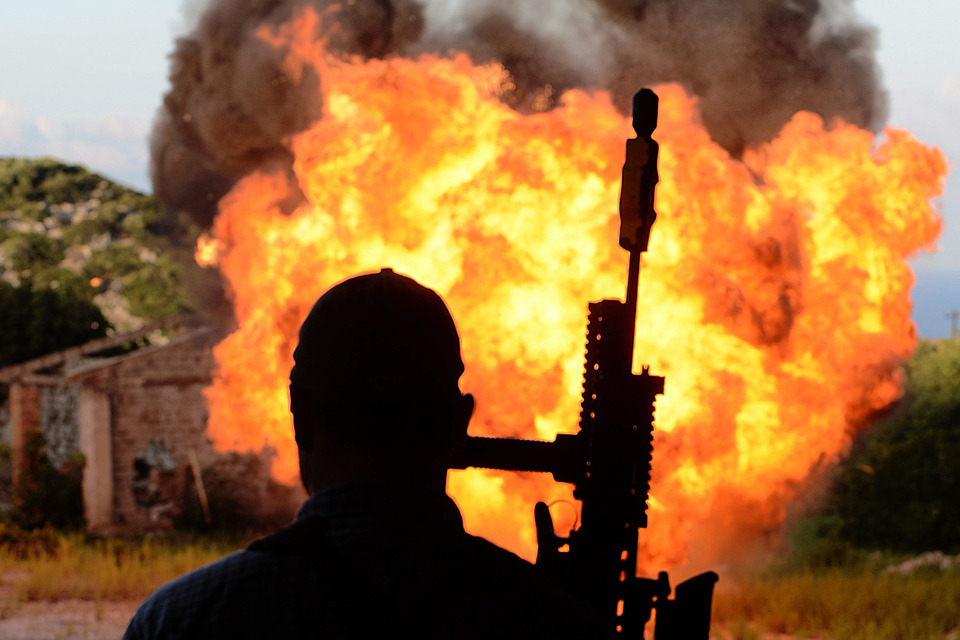 An enemy position is destroyed by a simulated air attack during the assault on Sazan Island [Picture: Petty Officer (Photographer) Sean Clee, Crown copyright]