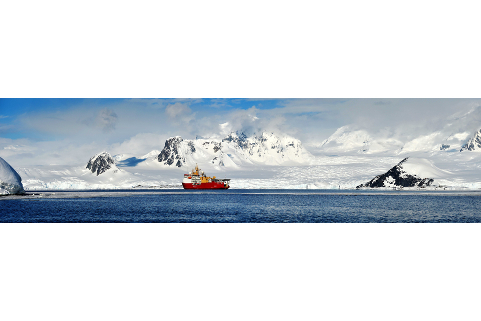 HMS Protector in her transit to Vernadsky Base with Antarctica's vast landscape as a backdrop [Picture: Leading Airman (Photographer) Vicki Benwell, Crown copyright]