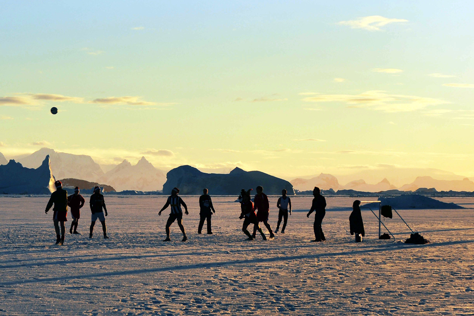 HMS Protector's ship's company playing football on the ice against the setting sun in Antarctica [Picture: Leading Airman (Photographer) Vicki Benwell, Crown copyright]