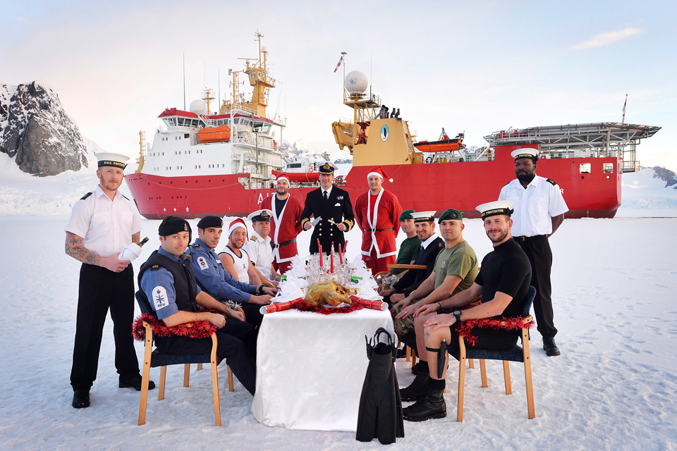 Crew members of HMS Protector sit down to their Christmas dinner on the ice [Picture: Leading Airman (Photographer) Vicki Benwell, Crown copyright]