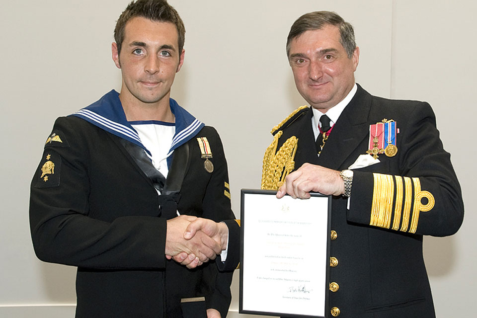 Admiral Sir Trevor Soar (right) presents the Queen's Commendation for Bravery to Leading Seaman (Diver) Carl Thomas [Picture: Petty Officer Airman (Photographer) Terry Seward, Crown Copyright/MOD 2010]
