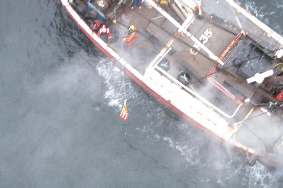 With all 4 sailors on board, Taff left our hi-line on the fishing boat and we positioned the helicopter above the deck to winch him clear.