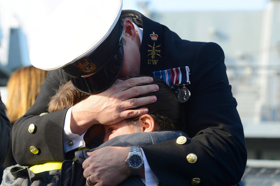 A Royal Navy chief petty officer is reunited with his family in Portsmouth [Picture: Leading Photographer Maxine Davies, Crown copyright]