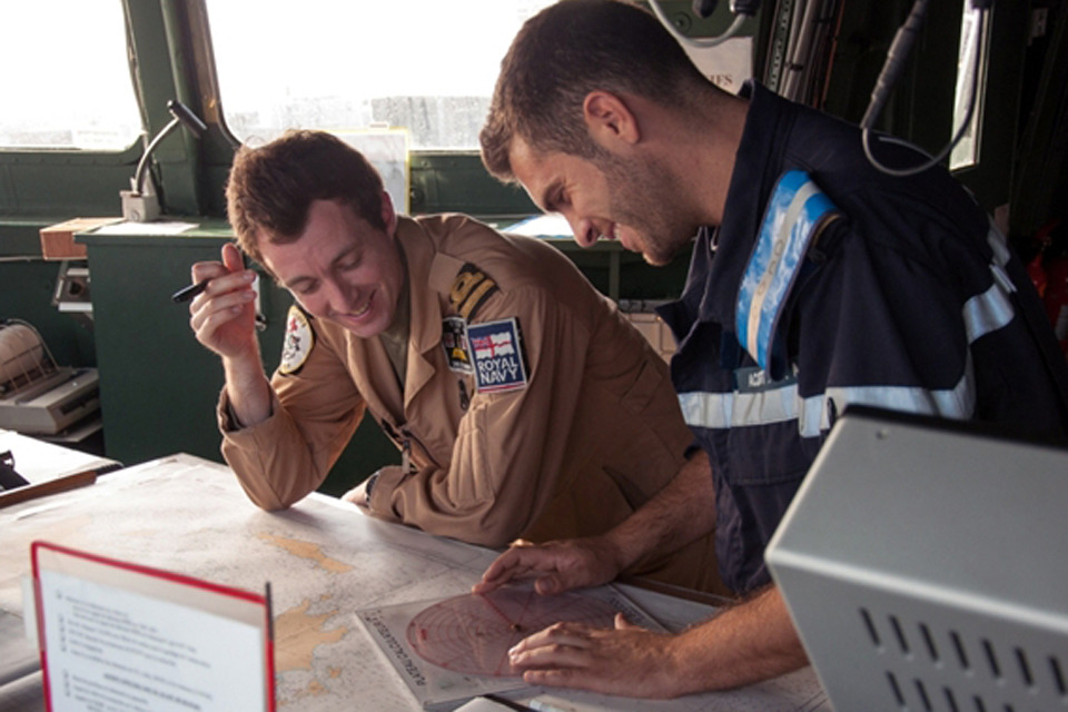 A member of 815 Naval Air Squadron and a French sailor work together on board FS Surcouf [Picture: Crown copyright]