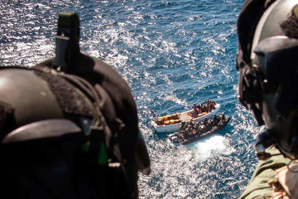 Thanks to the Lynx, the 2 suspected pirate boats were located, and afterwards the aircraft provided cover for the Surcouf’s boarding team as they apprehended 12 men. The suspected pirates were subsequently handed over to authorities in Mauritius.