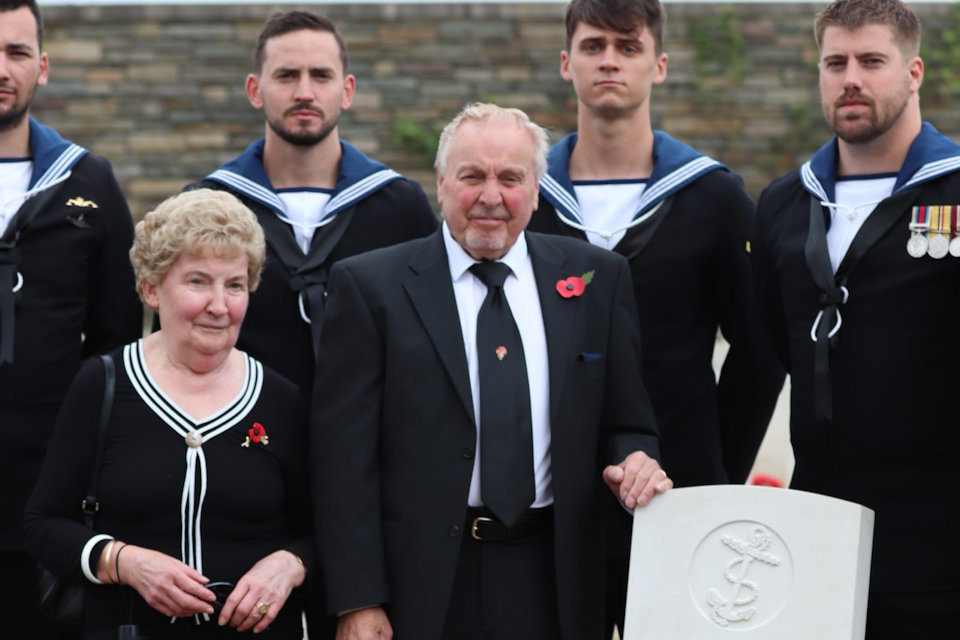 Nephew Frank Treasurer standing with his wife and members of the Royal Navy beside the grave of AB Robertson, Crown Copyright, All rights reserved