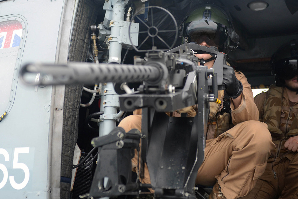 A Royal Marine from 43 Commando mans the 0.50-calibre M3M machine gun of Argyll's Lynx Mk8 helicopter [Picture: Leading Airman (Photographer) Pepe Hogan, Crown copyright]