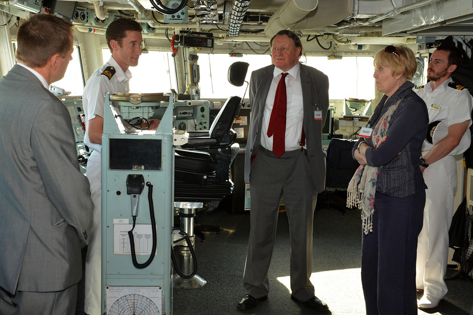 Monmouth's navigating officer briefs Sir John Stanley and other NATO delegates on the bridge of HMS Monmouth [Picture: Leading Airman (Photographer) Will Haigh, Crown Copyright/MOD 2013]