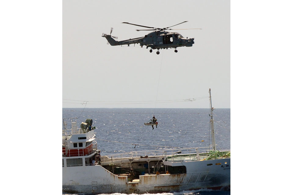 HMS Argyll's Lynx helicopter carries the injured fisherman from the Japanese trawler Wakashio Maru No 82 [Picture: Leading Airman (Photographer) Pepe Hogan, Crown copyright]