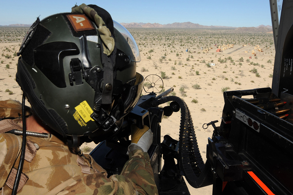 Corporal Rob Hughes mans a 12.7mm M3M Browning machine gun fitted to a Lynx Mk9A helicopter from 847 Naval Air Squadron during a gunnery shoot on the ranges surrounding the US Naval Air Facility at El Centro [Picture: Petty Officer (Photographer) Mez Merrill, Crown Copyright/MOD 2012]