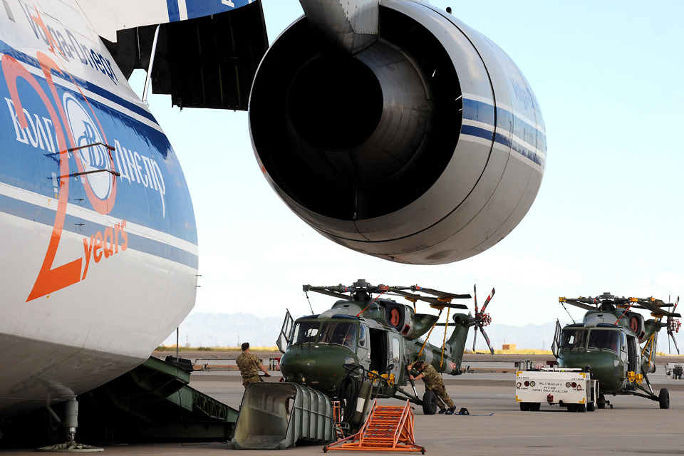 Royal Navy Lynx Mk9A helicopters from 847 Naval Air Squadron being loaded onto a Russian Antonov 124 cargo plane for transportation back to the United Kingdom [Picture: Petty Officer (Photographer) Mez Merrill, Crown Copyright/MOD 2012]