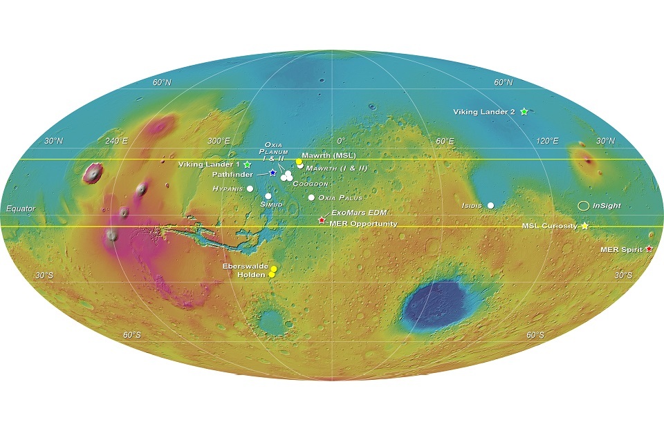 The workshop attendees favoured 4 candidate sites – all of which are located relatively near the equator - that were considered to be the most likely to achieve the mission’s objectives. They are: Mawrth Vallis (for which 2, very similar, proposals were received), Oxia Planum, Hypanis Vallis and Oxia Palus.