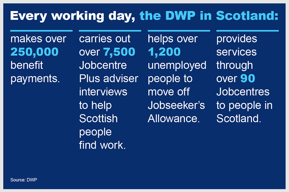 Every working day in Scotland, DWP makes over 250,000 benefit payments, carries out over 7,500 Jobcentre Plus interviews, helps over 1,200 people move off Jobseeker's Allowance and provides services through 90 Jobcentres.