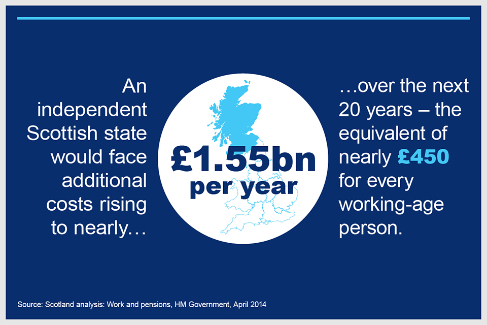 As people live longer the costs of providing pensions and benefits are predicted to go up and these costs are better absorbed by the bigger, more diverse UK economy – with more taxpayers and less reliance on oil revenues – than an independent Scotland.