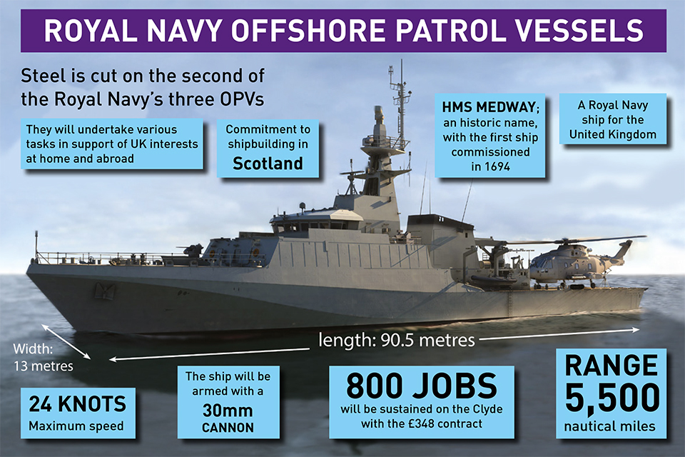 Steel was cut on HMS Medway today at a ceremony in Glasgow. The vessel is one of three OPVs, and part of a programme that has protected more than 800 Scottish jobs. It will be used by the Royal Navy to undertake tasks in support of UK interests both at home and abroad. They are being built at BAE Systems’ (BAES) shipyards on the Clyde as part of a £348 Million contract.