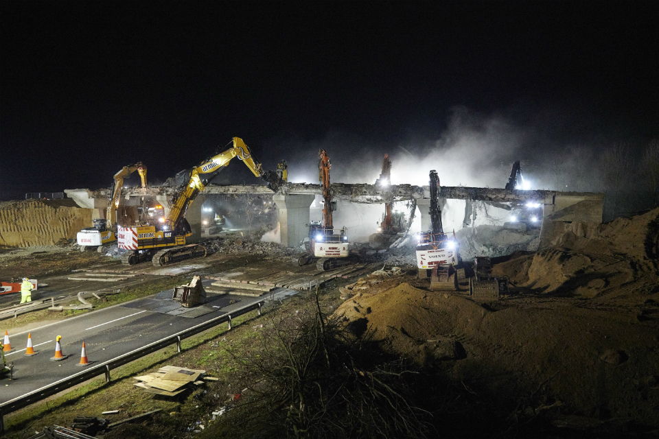 Demolition of the old Brampton Road bridge over the A1 on 17 February 2018