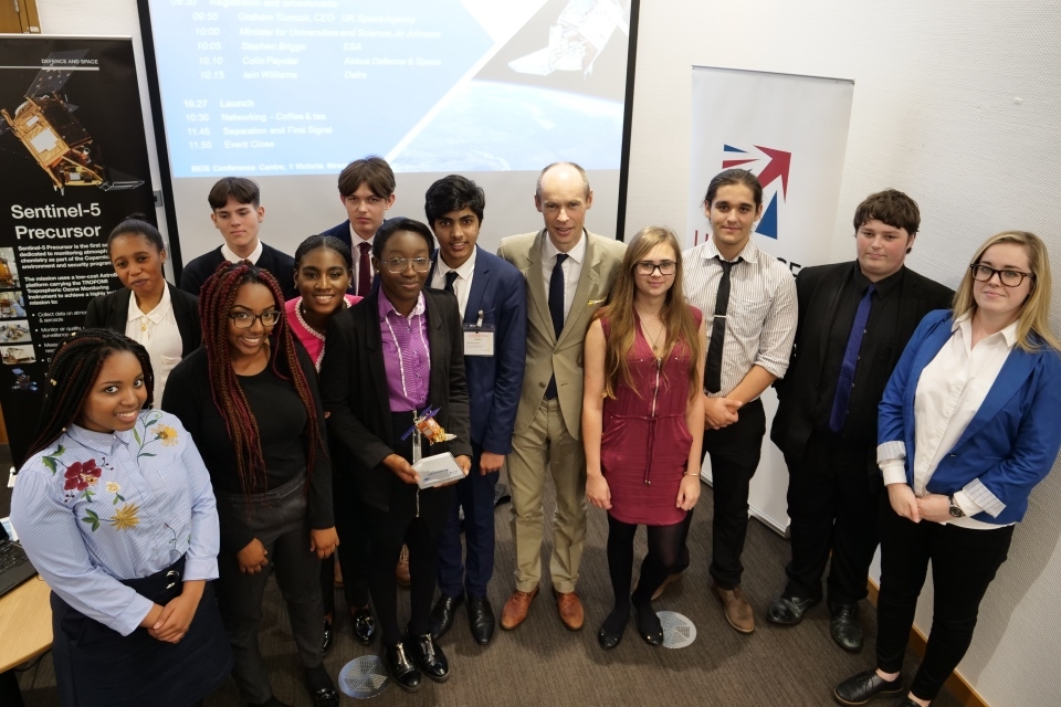 Graham Turnock, CEO of the UK Space Agency, with sixth form students from Drapers Academy in Romford who were invited by the UK Space Agency to the launch event in London.