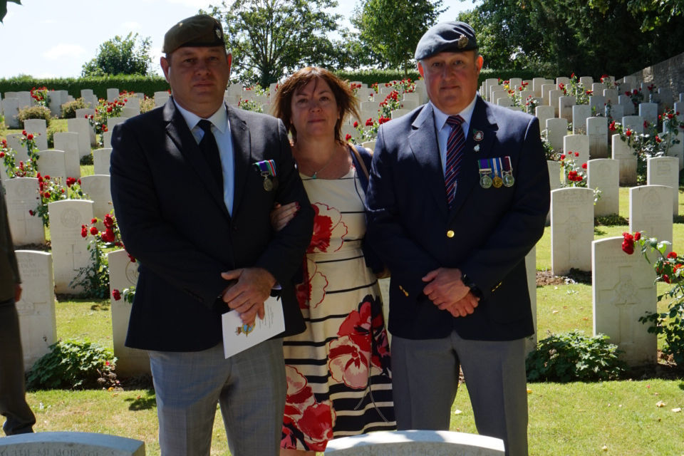 Great niece Terri Griffin with two members of the family behind the headstone of Sergeant Watson. Crown Copyright. All rights reserved.