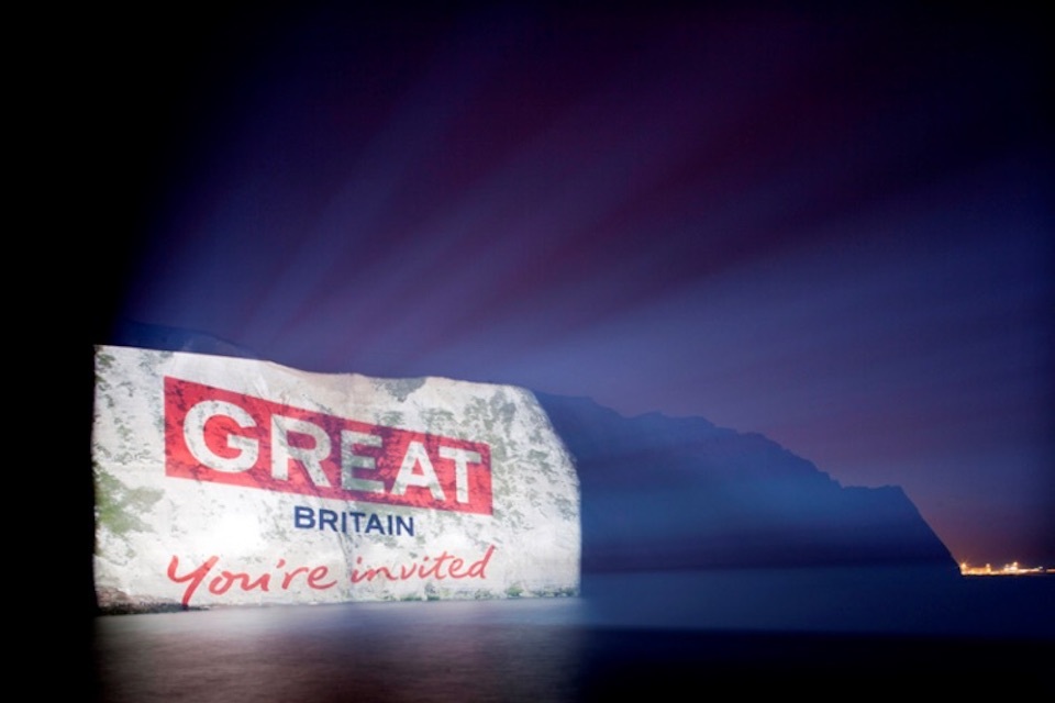 Welcome to GREAT Britain projected on the White Cliffs of Dover