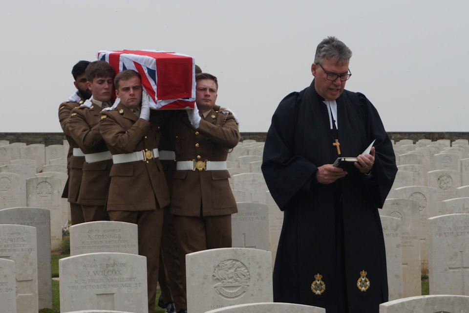 The Reverend Tim Flowers conducts the burial service at the graveside of the unknown soldier in Guards Cemetery, Lesboeufs, Crown Copyright, All rights reserved