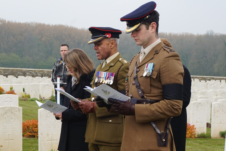 Capt Benedict Griffiths and Lt Col Ret'd Dominic Hancock participate in the burial service of the unknown Sherwood Forester at Guillemont Road Cemetery, Crown Copyright, All rights reserved
