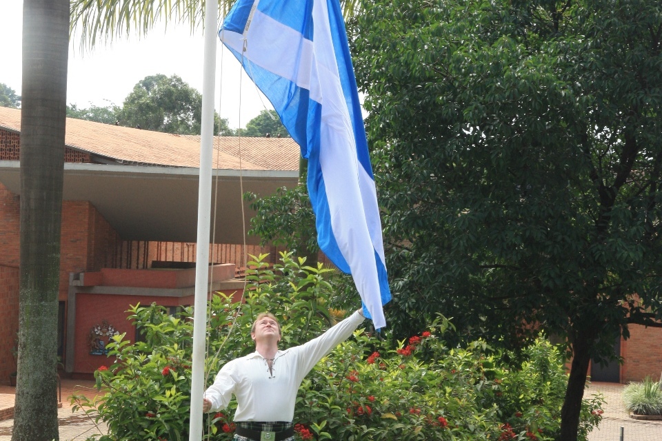 On Friday 28 November 2014, the British High Commission marked St Andrew’s Day, the national day of Scotland, by flying the Saltire of St Andrews, Scotland’s national flag. St Andrew’s Day is on 30 November, which this year falls on a Sunday. Dressed in the kilt, the most famous element of Scotland’s national costume, Clark Adam, a member of staff at the High Commission and a proud Scot, took charge of raising the Saltire on the High Commission’s flagpole.