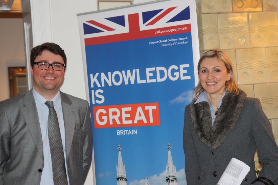 UKTI Trade Advisor with Ms Marija Vujica from the Agency for education and translations "Libar" standing in front of the Knowledge is GREAT banner.