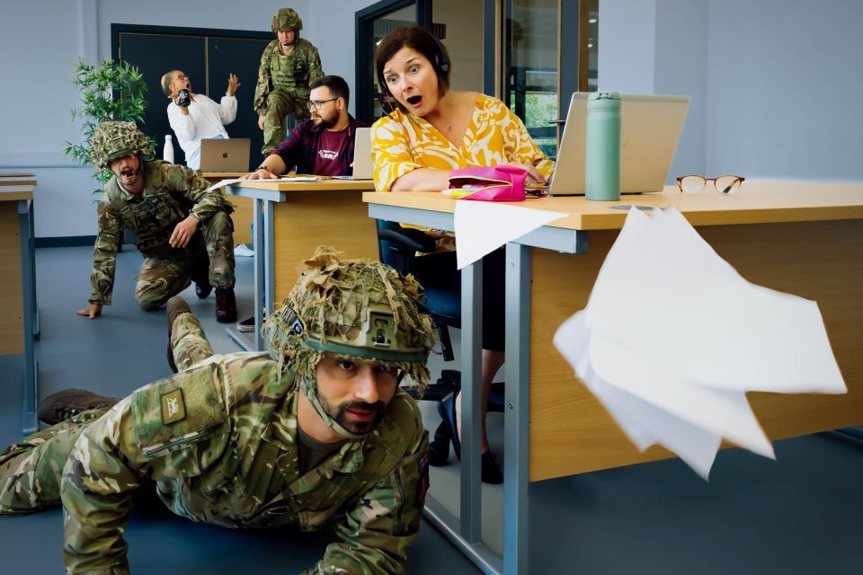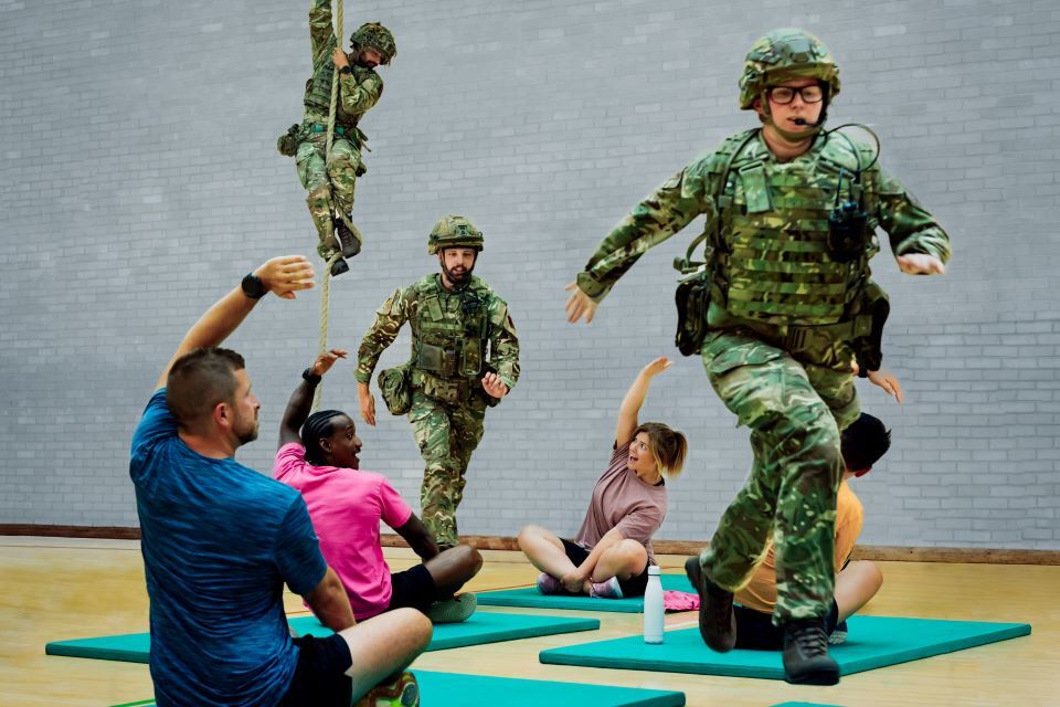 Soldiers sprinting through a salon, abseiling into gyms and crawling through offices feature in a striking new campaign by the Ministry of Defence, turning the tables on the issue of public interruptions to military training exercises.