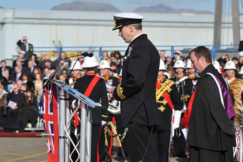The Commanding Officer of HMS Ambush, Commander Peter Green, addresses the crowd at the commissioning ceremony [Picture: Petty Officer (Photographer) Ian Arthur, Crown copyright]