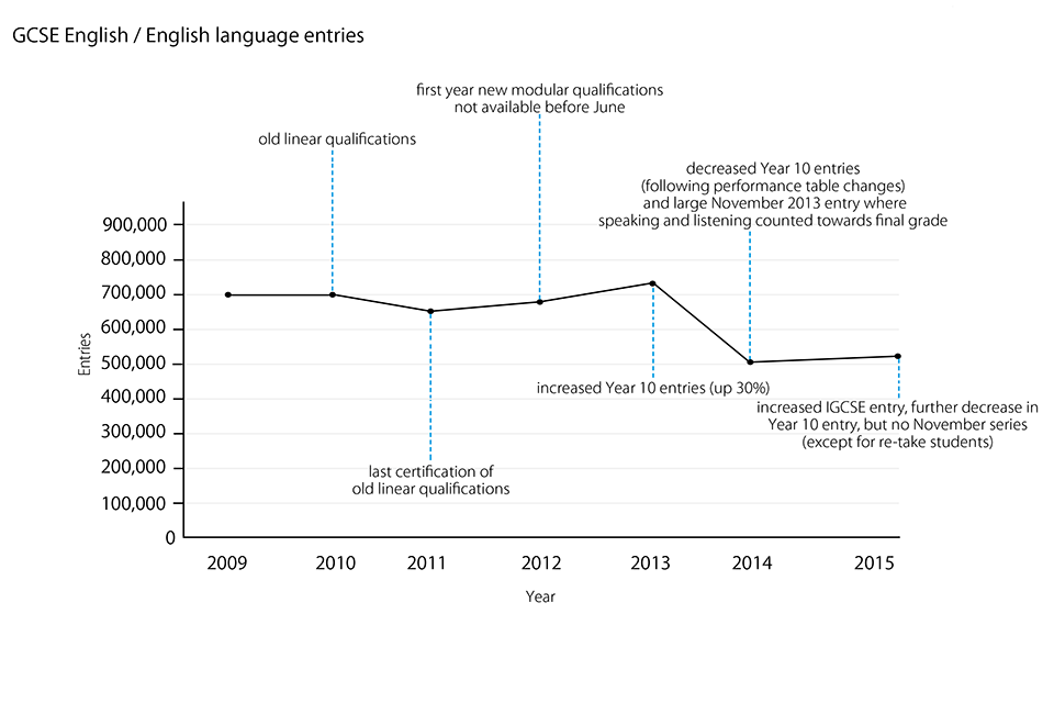 Entry figures for English/English language have fluctuated in recent years, as a result of changes to the qualifications and policy changes. The chart below shows the summer entry numbers 2009 to 2015 together with details of the other changes.