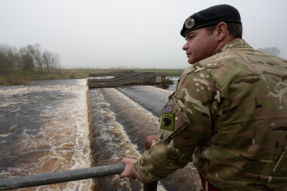 A sapper from 21 Engineer Regiment inspects the flood defences on the River Tees (library image) [Picture: Sergeant Paul Morrison RLC, Crown copyright]