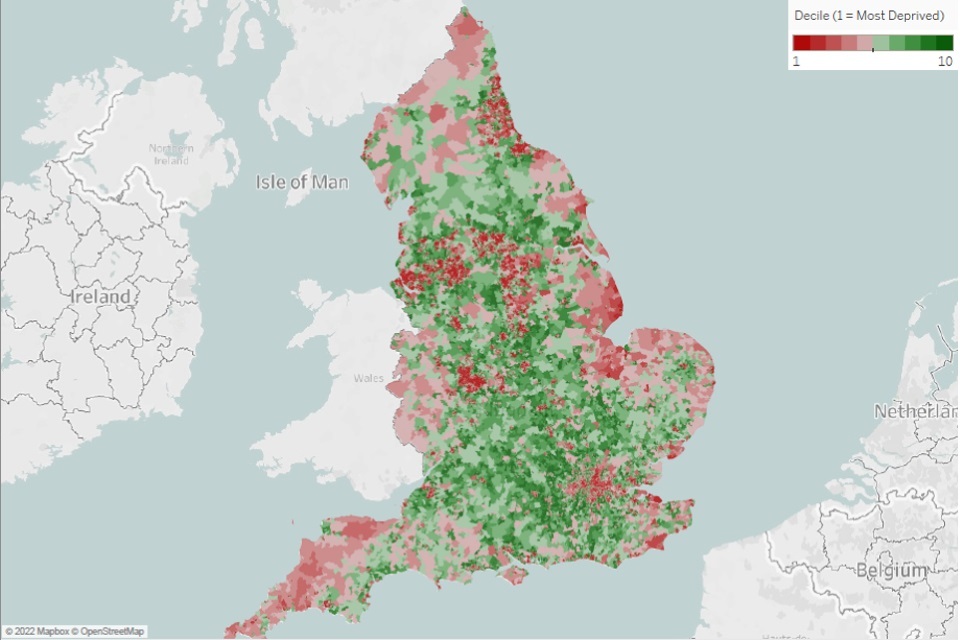 The diagram provides a visual summary of the levelling up challenge in England. The areas in red are ranked as the most deprived.