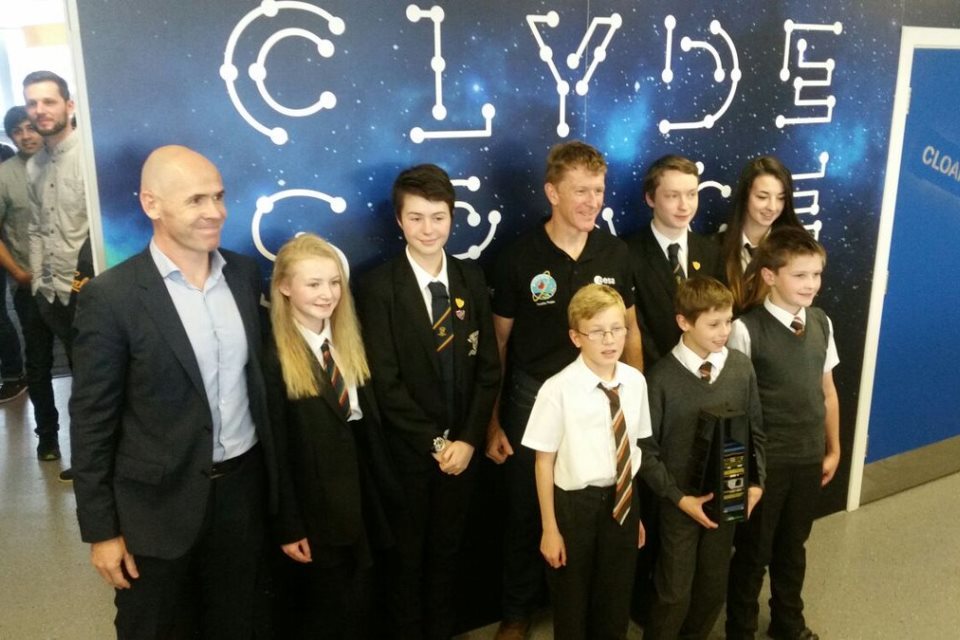 Tim Peake with young people and Chief Executive of Clyde Space.