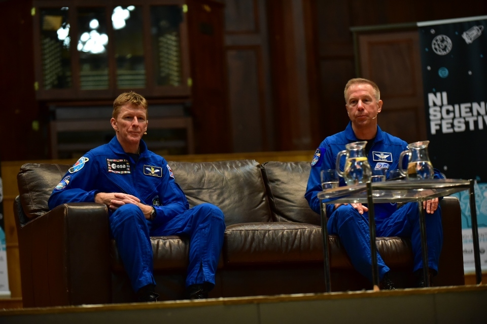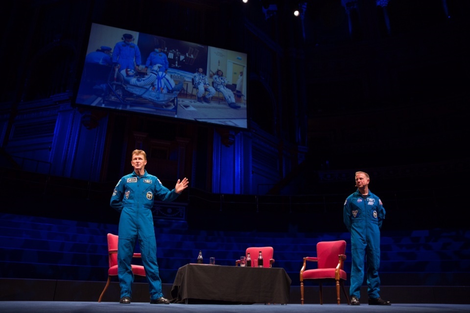 Astronauts Tim Peake and Tim Kopra on stage at Ulster Hall, Belfast. Credit: Neil Harrison.