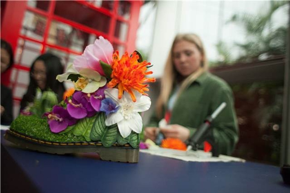 On the sideline of the catwalk, Dr Martens had its own boot painting session nearby. Two artists, one British and one Chinese, were invited to demonstrate their creativity. One turned a pair into a starry night, and the other, from Central Saint Martins’ College, turned a pair of boots into mini Kew Gardens in 3D. A “Food is GREAT”-branded food and drink display highlighted the best of British produce.