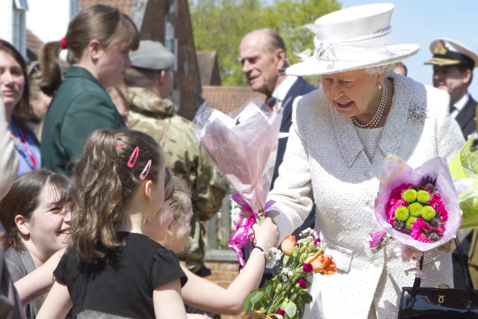 On leaving the rehabilitation buildings the Queen received posies from local children before entering the Officers’ Mess where she signed the visitors’ book and posed for a group photo before a private lunch.