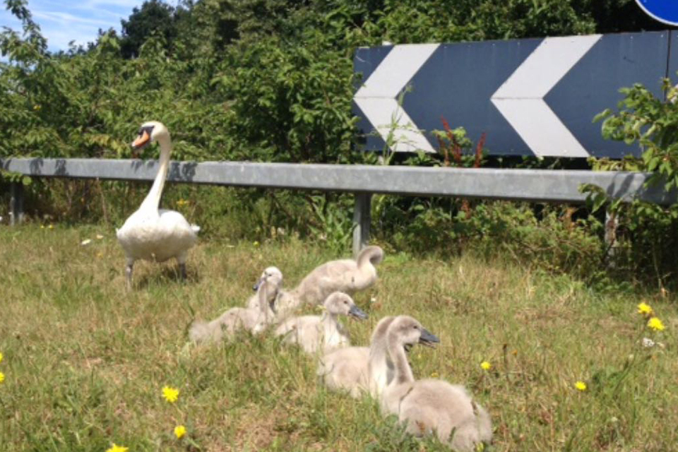 A couple of swans and their six cygnets were spotted wandering the hard shoulder of the M20 near junction 4, with the A228 at Larkfield in Kent, likely trying to get to the lake on the far side.