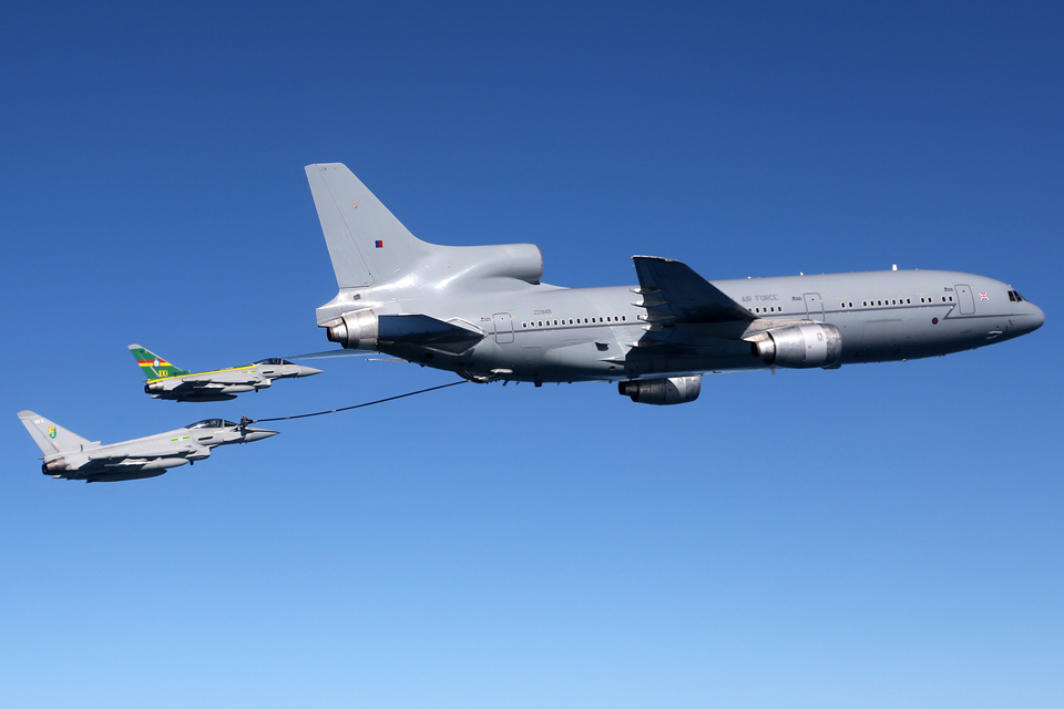 An RAF Typhoon is refuelled by a TriStar over the North Sea [Picture: Squadron Leader Dylan Eklund, Crown copyright]