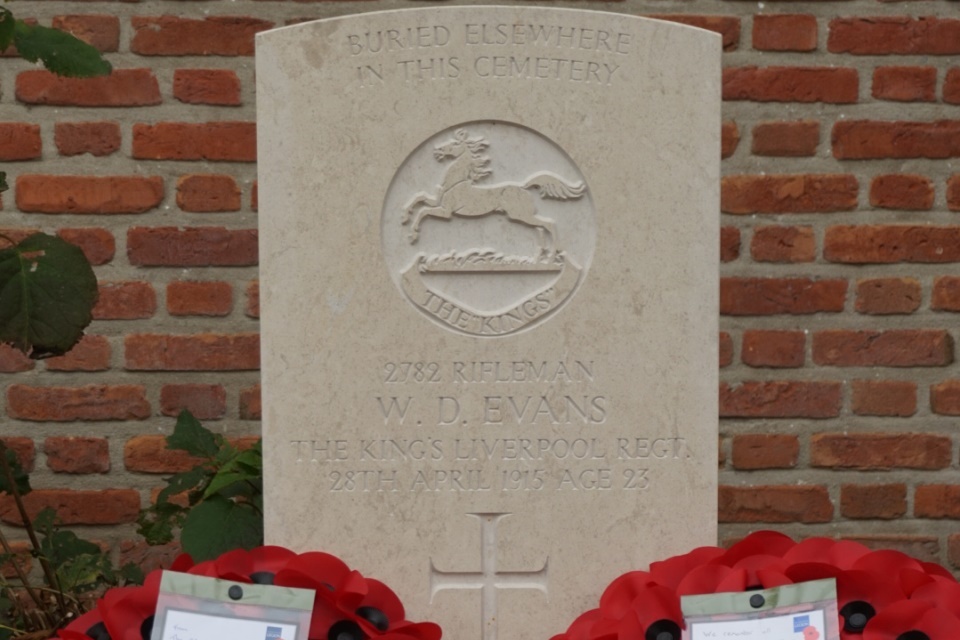 Rifleman Evans enlisted in Liverpool on 7 November 1914 as part of the Liverpool Brigade West Lancashire Division. He sailed from Southampton to Le Havre in February 1915 and joined the 15th Brigade 5th Division serving with the Expeditionary Force. His total service was 173 days before being killed during the second Battle of Ypres on 28 April 1915, aged 22 years old.