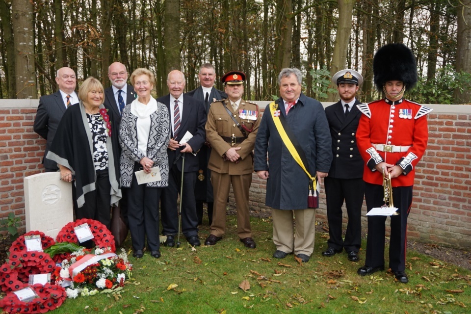 Standing by the graveside of Rifleman Evans his family; Regimental representatives and Deputy Mayor of Ypres; Sub lt Fred Warren Smith; and Max Harris, trumpeter. Crown Copyright. All Rights Reserved.