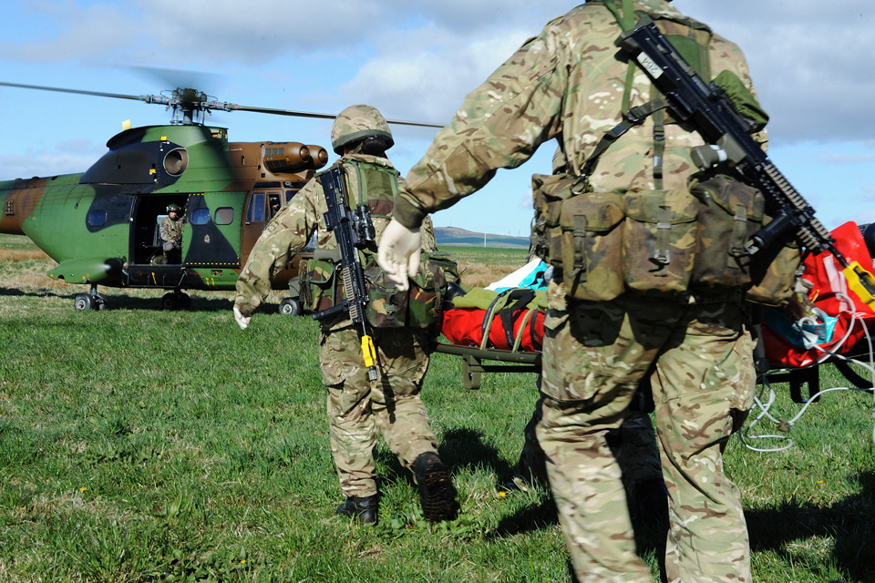 Army medics transfer a simulated casualty from a battlefield ambulance during Exercise Joint Warrior [Picture: Corporal Obi Igbo, Crown copyright]