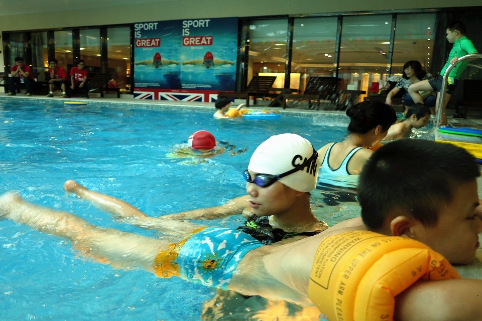 Ms Lin Ping, 2012 Paralympic swimming gold medalist coaching special needs children how to swim at the anniversary event.