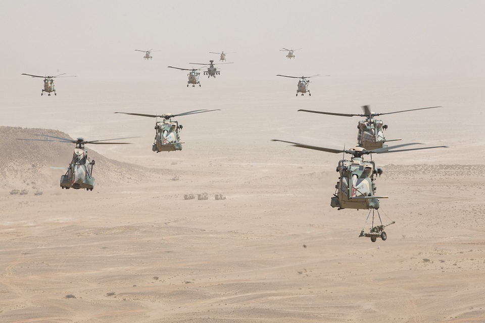 Royal Omani Air Force helicopters take part in the Exercise Saif Sareea 3 firepower demonstration. One is seen carrying a 105mm gun.