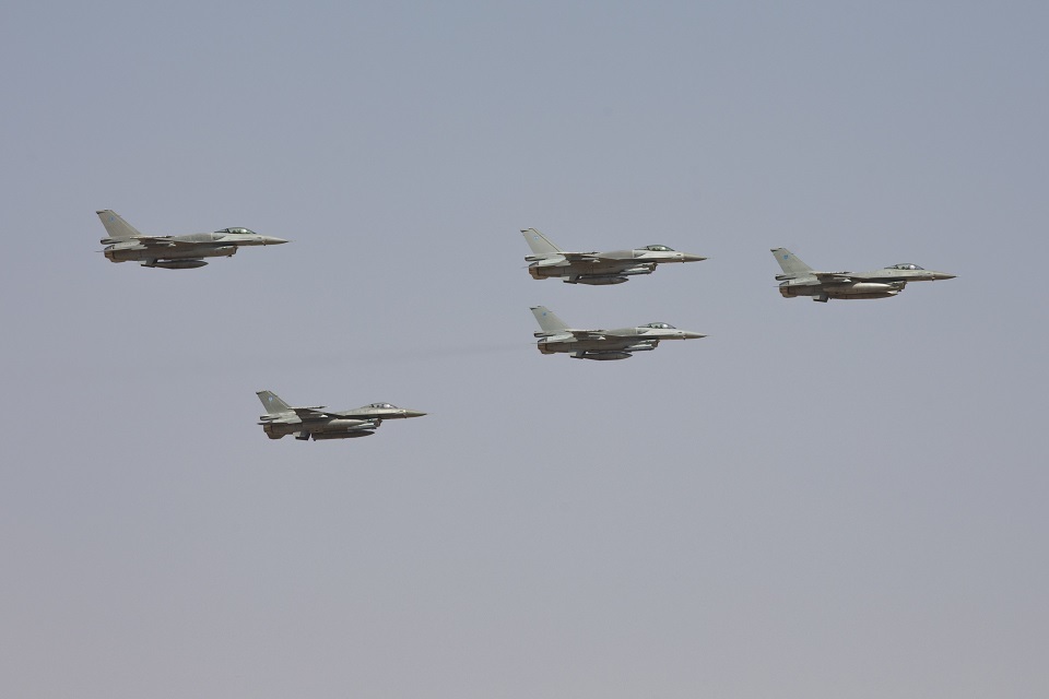 Fast jets lead a flypast during the Exercise Saif Sareea 3 firepower demonstration. Crown copyright.