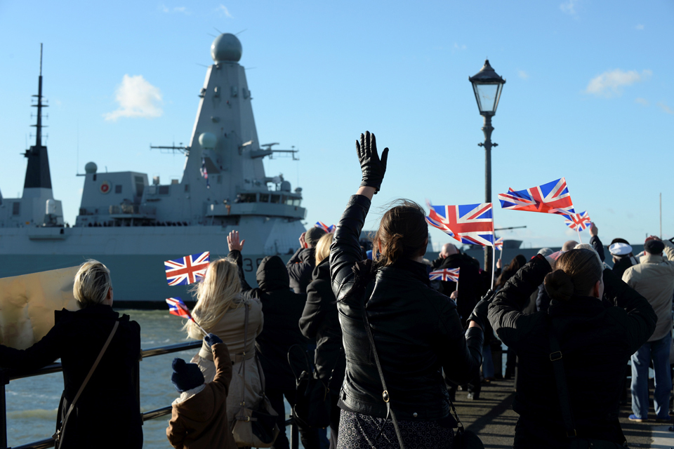HMS Defender returns to a warm welcome in Portsmouth on 9 January 2014 [Picture: Leading Airman (Photographer) Simmo Simpson, Crown copyright]