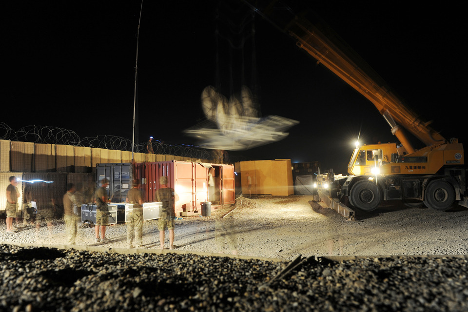 A crane works through the night helping to dismantle the last of the communication systems used by troops in Forward Operating Base Shawqat [Picture: Corporal Si Longworth RLC, Crown copyright]