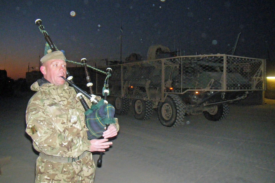 Warrant Officer Class 2 Andrew Lambert pipes the manoeuvre battle group out of their base [Picture: Crown copyright]