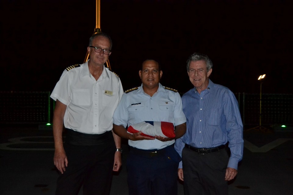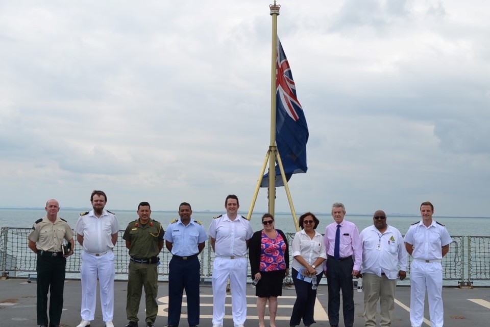 Flag presentation after the ceremonial sunset ceremony. Captain David Buck (CO Mounts Bay) Admiral John Borland (BCG) Peter Hughes (High Commissioner)