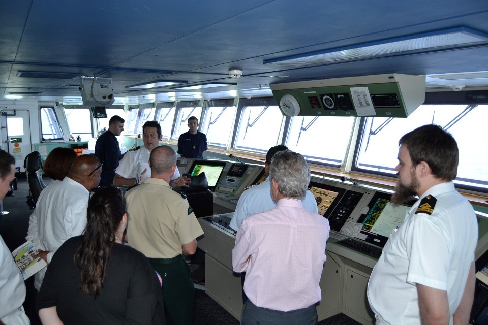 Representatives from the British High Commission, BATSUB, BDF, Coastguard, Belize Red Cross and NEMO on the bridge of RFA Mounts Bay.